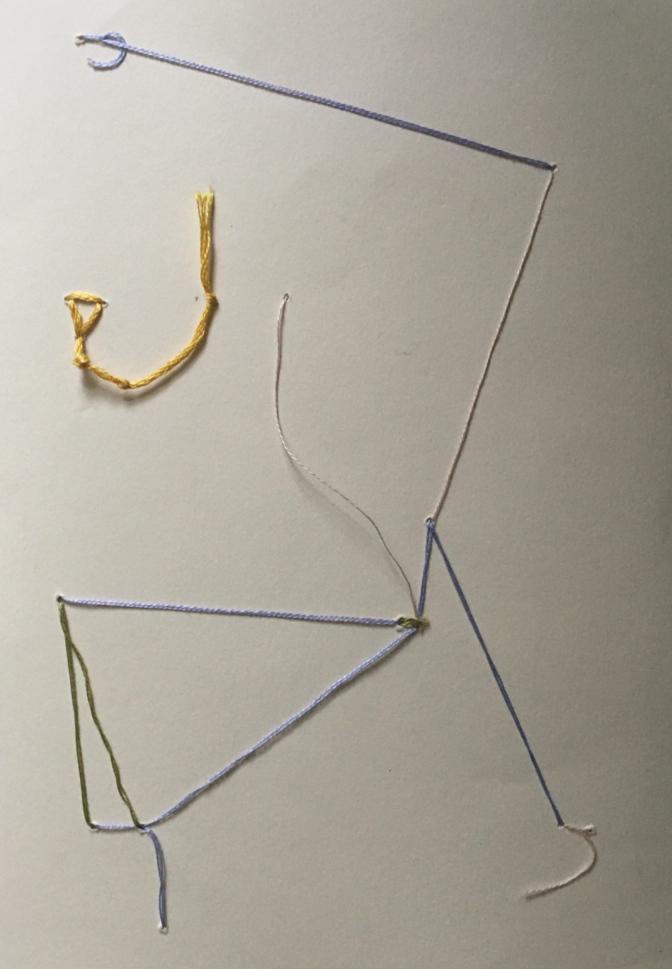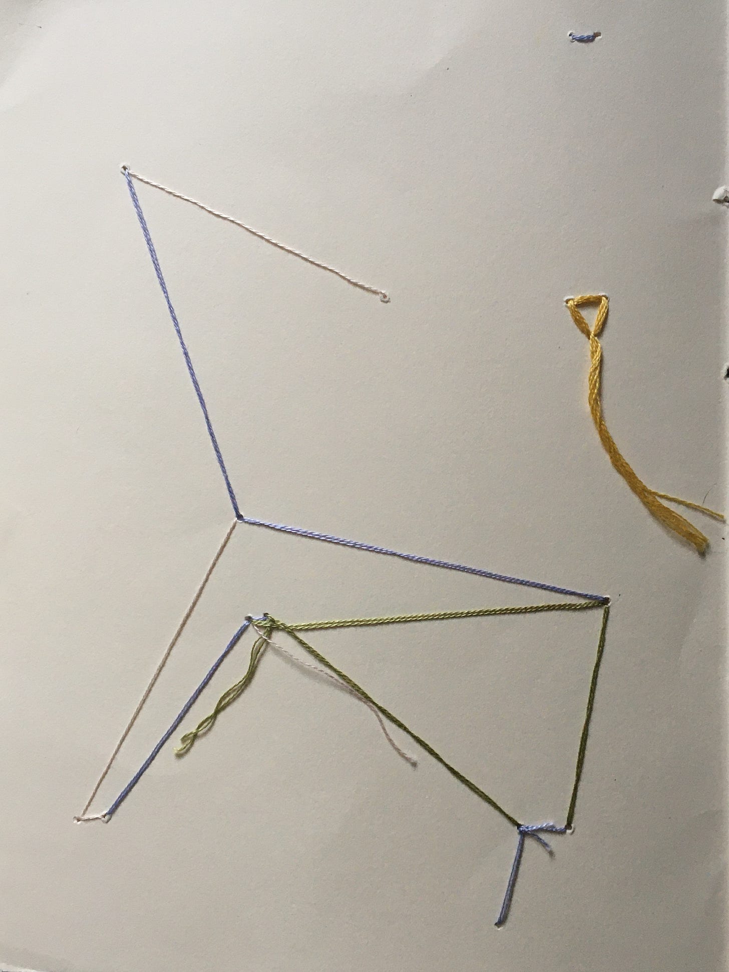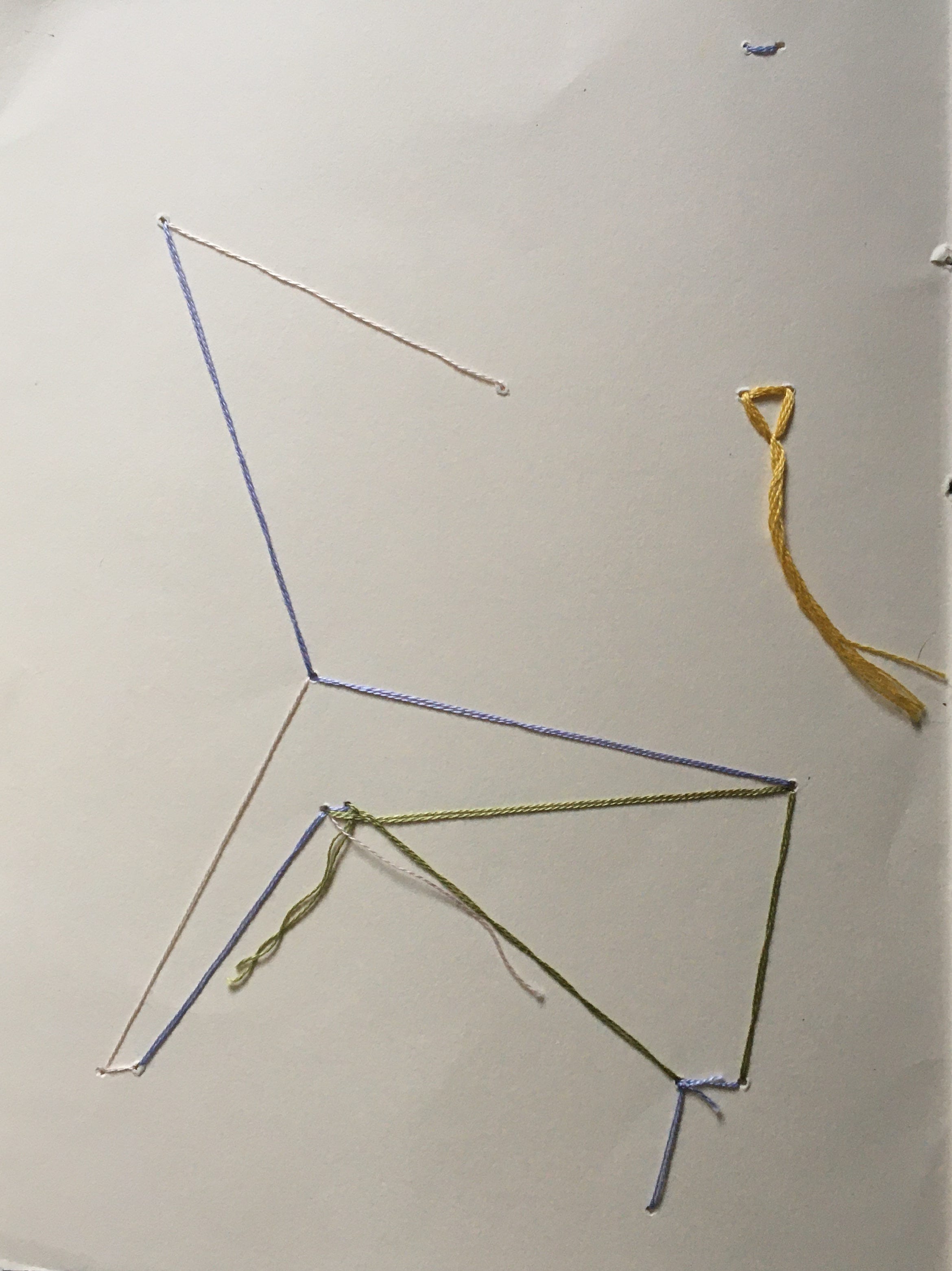 So, playing around with threads here, I punctuated the paper with an awl. I then selected four different threads, who ran their own paths. At certain points they met, sometimes all together, sometimes just with one other; sometimes they met more than once.